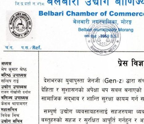 - सामाजिक सद्भाव र शान्ति–सुरक्षा कायम गर्न बेलबारी उद्योग वाणिज्य संघको अपिल